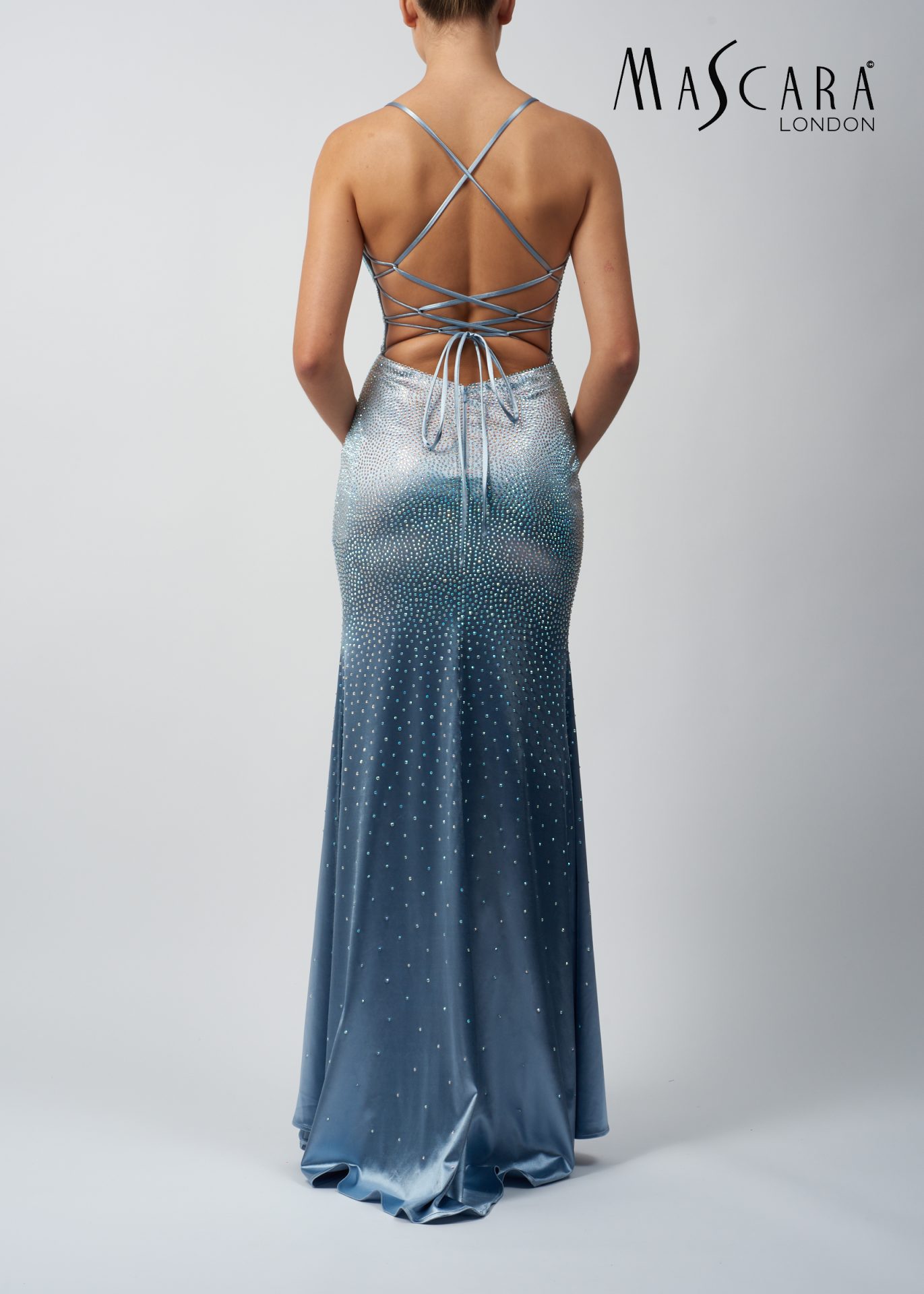 MC11327 A fitting satin beaded prom dress with a tie-up back.