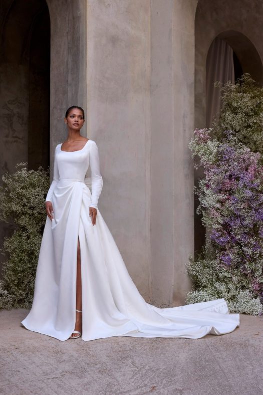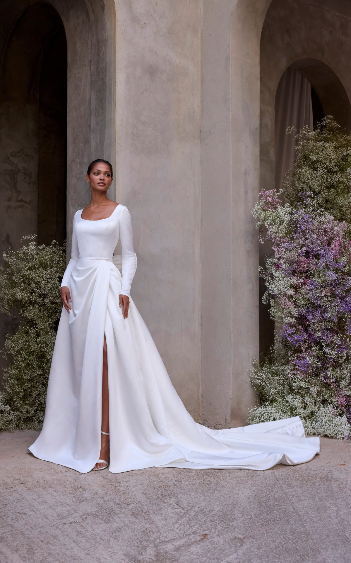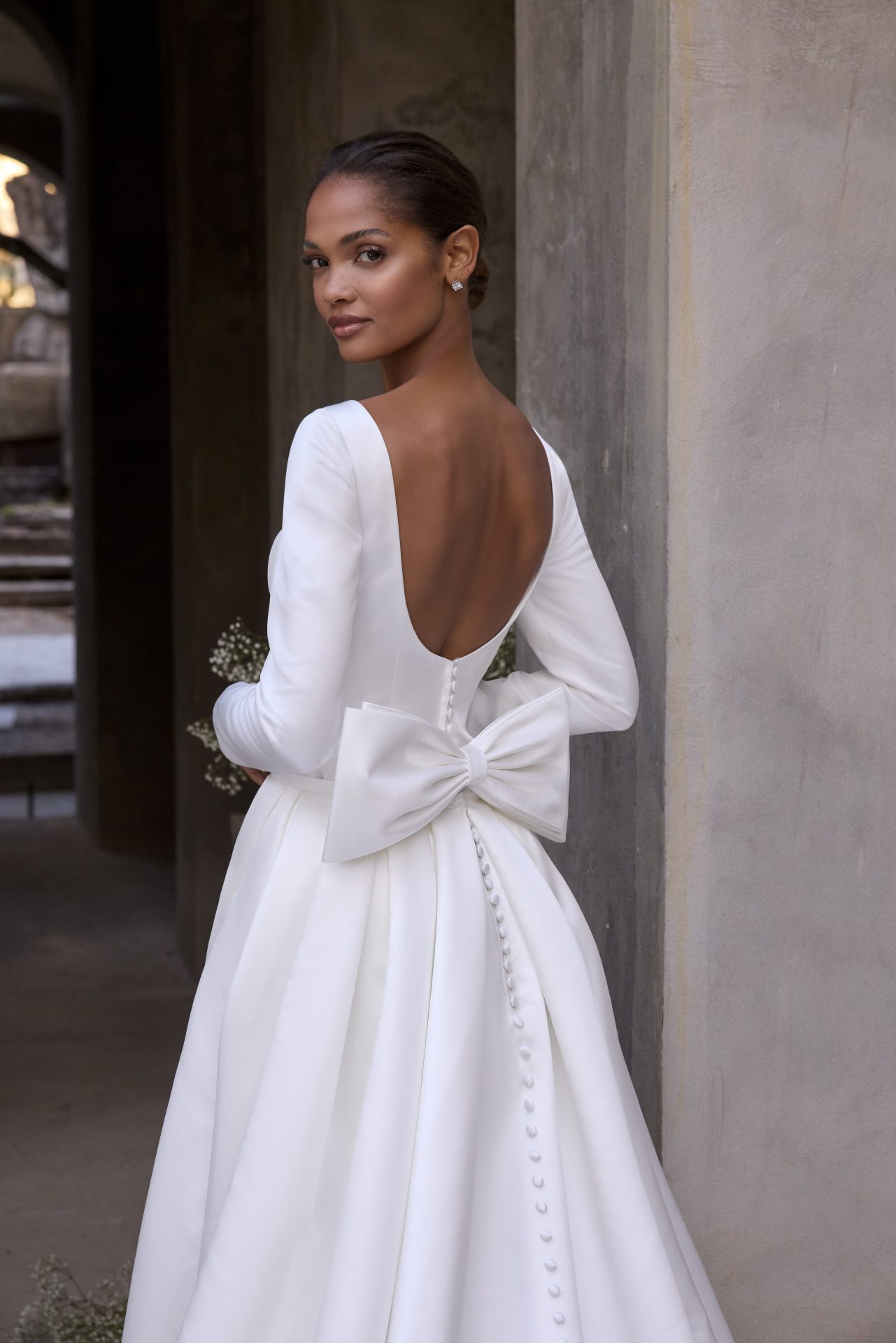 Morilee Virtue style 2965, is a satin mini wedding dress with long sleeves and a scoop low back. It also has a beautiful wrap detachable overskirt with pockets and a bow.